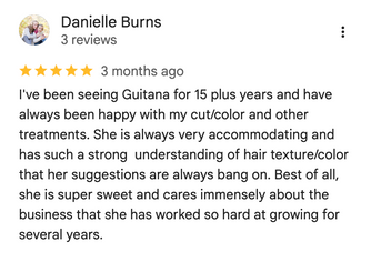 We have been clients of Bellezza Beauty for 10 years and my husband has been a client of Guitana's for over 15 years. She cuts, styles and colours with both knowledge and ability. It has been a pleasure to watch her business grow.